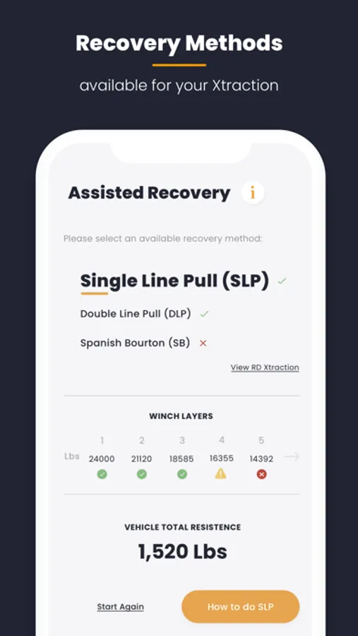 This app will ask for a few data inputs such as vehicle weight, gradient, ground condition, stuck wheels, and winch capacity - and then provide you with the Total Resistance (or Load) required in order to Xtract the stuck vehicle using either self-recovery and/or assisted recovery methods.