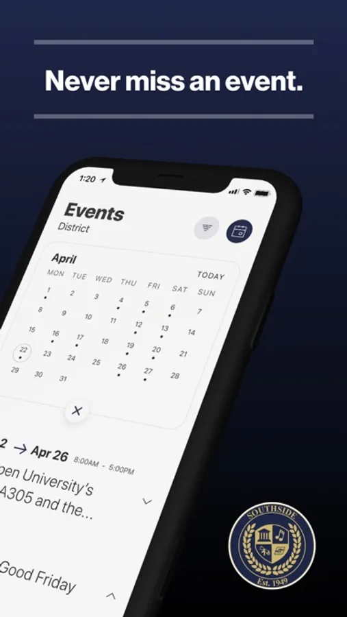 The event section shows a list of events throughout the district. Users can add an event to your calendar to share the event with friends and family with one tap.