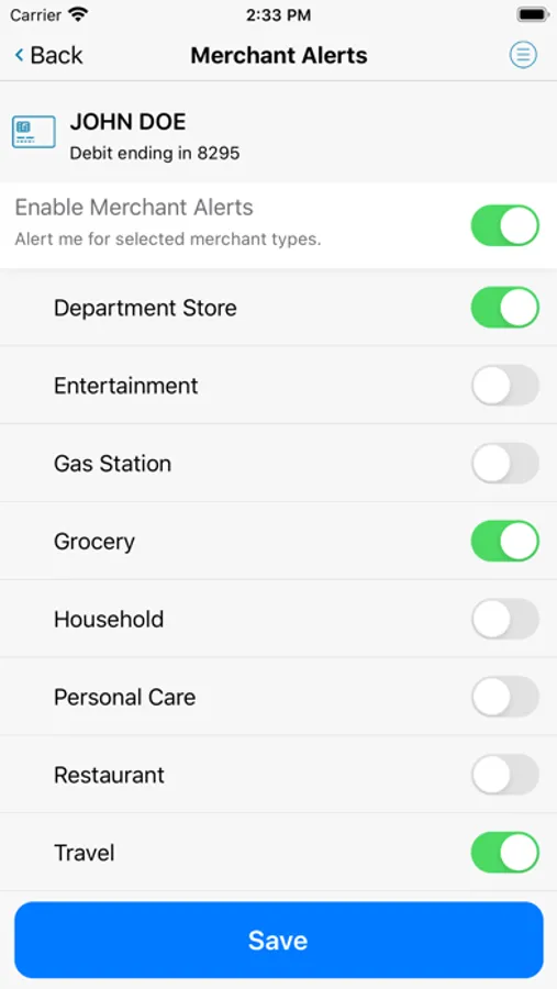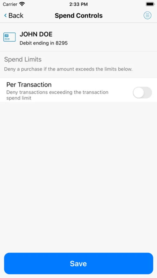 Set spending limits to restrict transactions above your thresholds. Monitor activity by category such as gas stations and restaurants, and by type: in-store purchases, e-commerce transactions and ATM transactions.