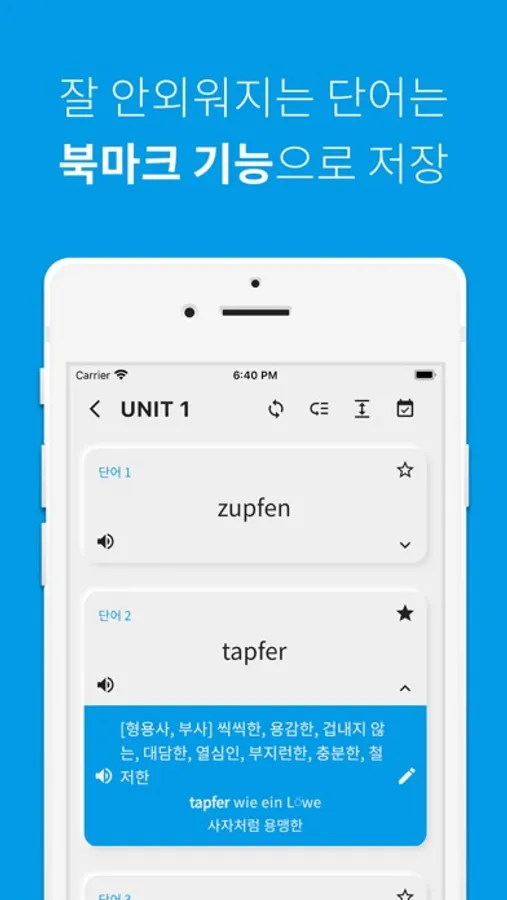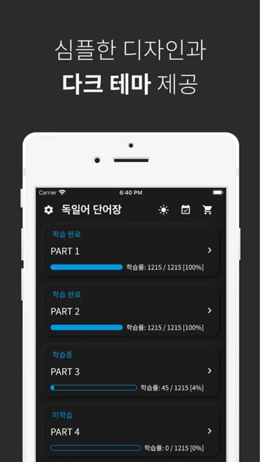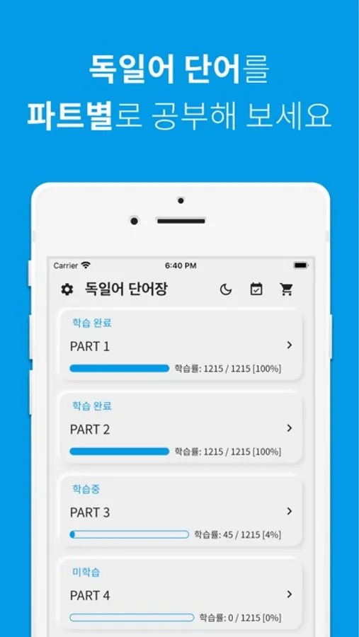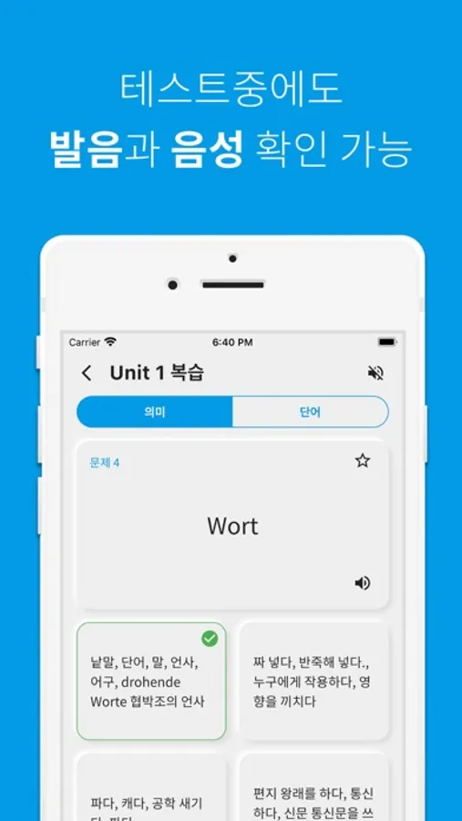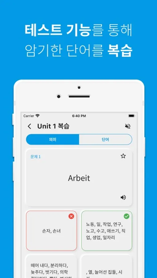 단어 공부는 역시 반복이죠! 공부한 독일어 단어를 파트별, 유닛별, 전체 단위별로 복습할 수 있습니다.
