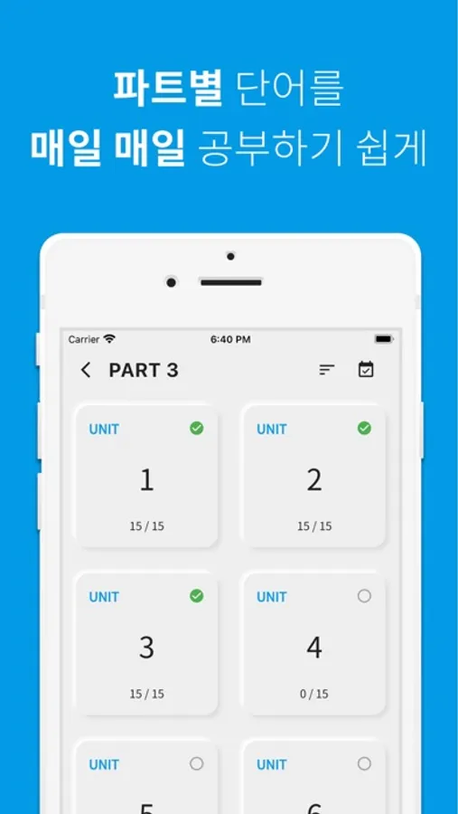 - 학습 진행률 설정/초기화: 파트 또는 유닛을 길게 눌러 학습 진행률을 설정하거나 초기화할 수 있습니다.