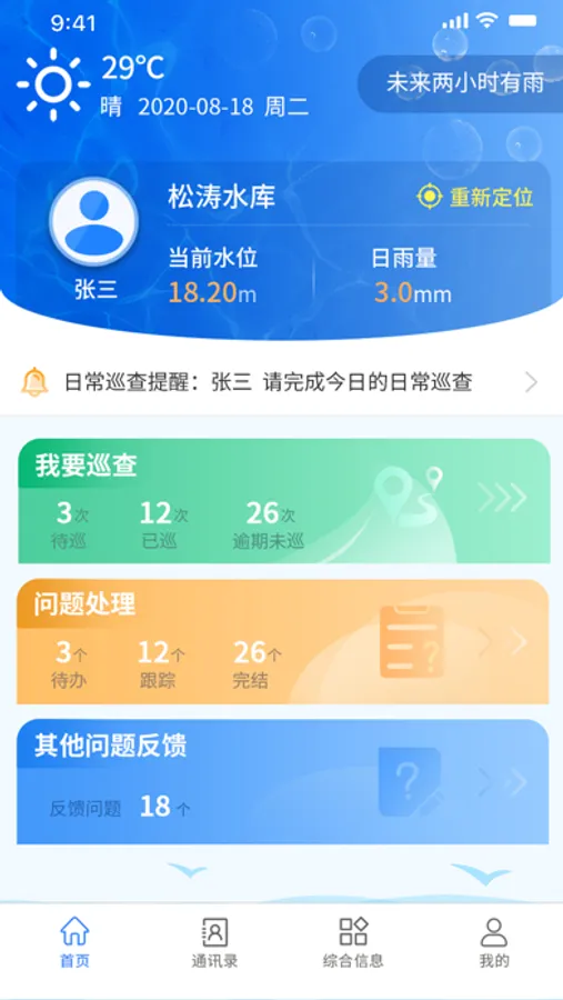 解决小水库物业化监管问题,为管理水库的相关人员提供便捷服务,可通过app为巡查责任人提供精准高效的巡查手段,同时提供水雨情监管、问题工单处理、巡查台账记录、天气预报、维修养护等功能,实现巡查过程和结果的可视化留痕管理。