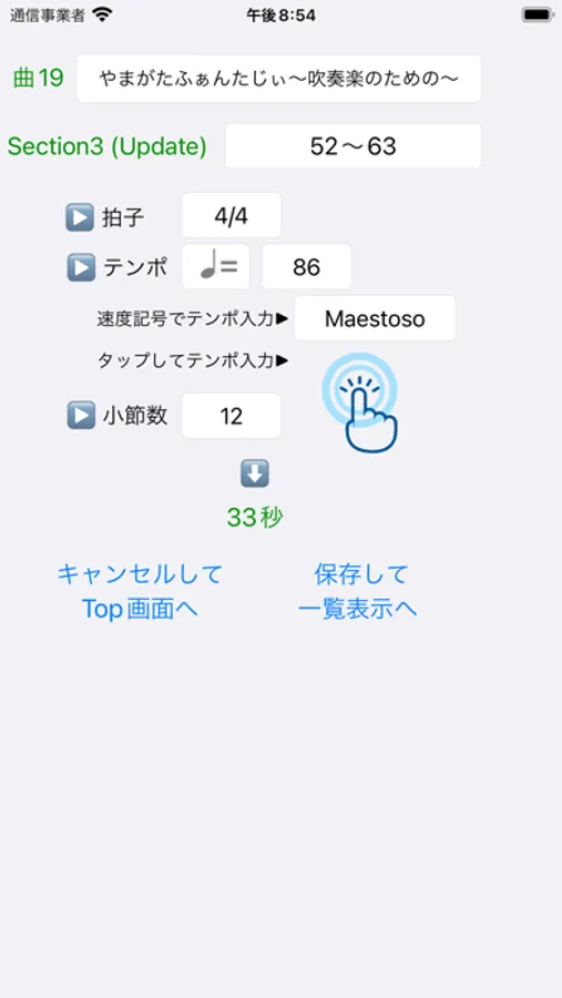 テンポの入力は、数字、速度記号(Allegro,Lentoなど)、画面のタップ、のどれでもOK。