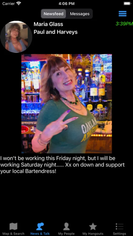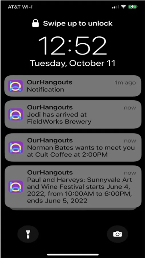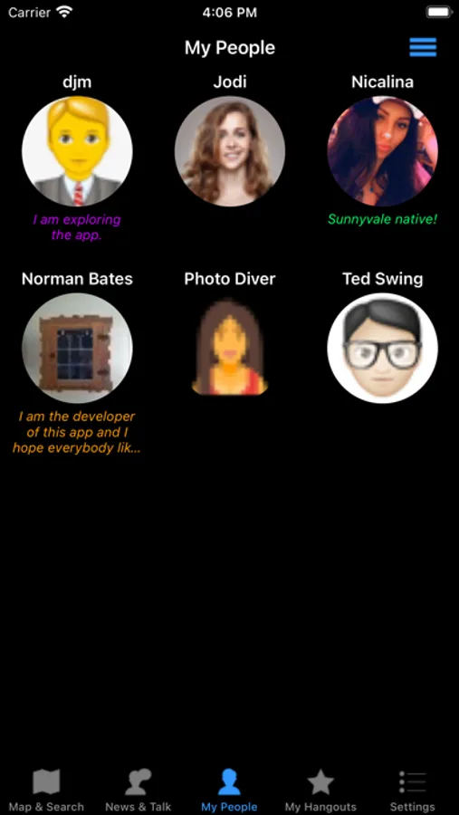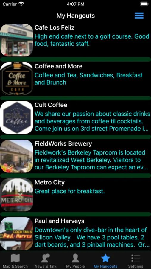 The idea behind OurHangouts is you meet people who like to go to the same places you do. You add places to your Hangouts list and then learn about events, people, and other things related to those places. The places you like can send you promotions, schedules, and other things. As you get to know people by connecting to places you can communicate with them thru messaging. OurHangouts also allows you to easily arrange meets at places with friends whom you already know, without playing phone tag. (See guide on website for more details.)