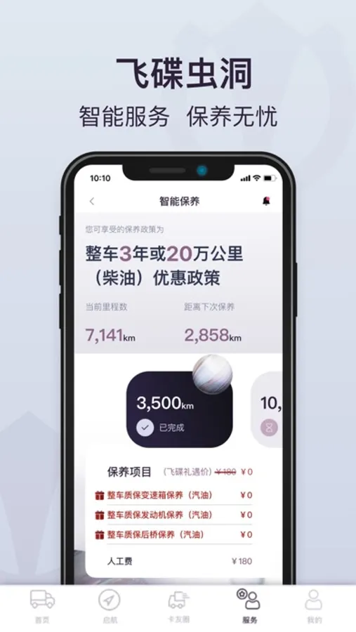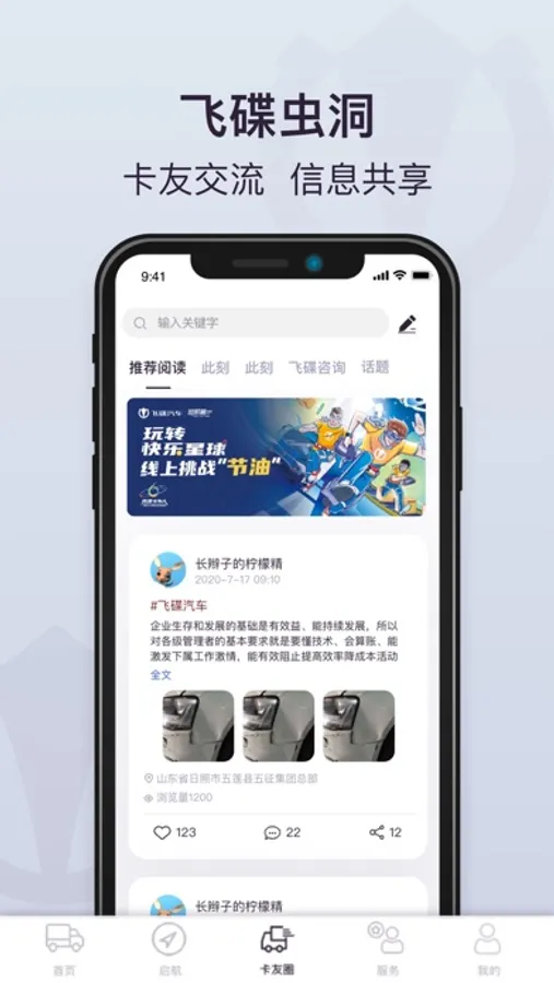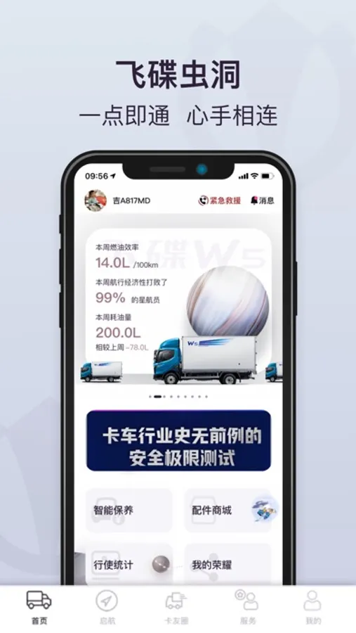 探索更多,不止于车,数字未来飞碟汽车与您同行。智能导航为您比选路线,在油耗与高速费用间选择成本最优路线,为您的收益保驾护航;搭载智慧车联网360°透视爱车车况,让您随时随地轻松了解爱车状况;全时检测运输路上的每一步,定期提醒您进站保养,还可预约维保,3年/20万公里整车质保线上线下双重保障;监测车辆运行状态坐每一位飞碟车主驾驶习惯,不断优化并未车主提供针对您个人健康特点的健康呵护,为关心您的家人尽一份心意。黑科技护航,零距离服务更贴心;“人、车、货”多维互通,网络纽带陪伴您运输路上的分分秒秒,数字空间联通您的梦想和未来。