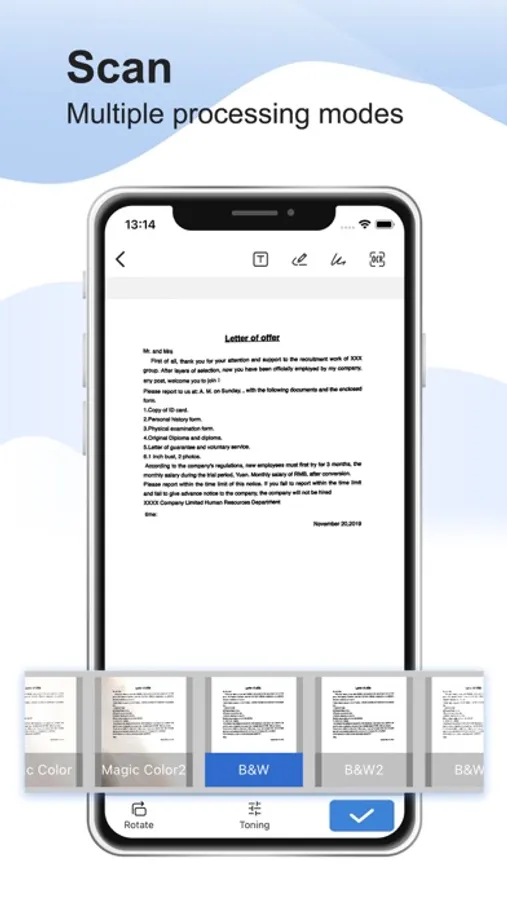 - A variety of image processing mode, you can manually adjust the image parameters, with a mobile phone can be paper documents, quickly turned into a clear electronic draft.