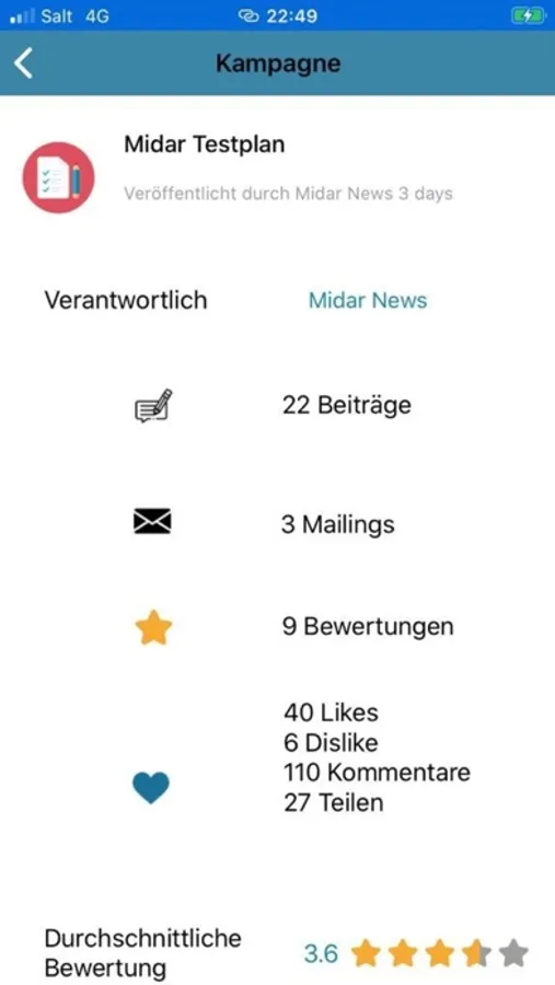 Midar App users can directly receive posts on the message area on the lock screen, ensuring top attention. With a click, they can provide feedback (likes, dislikes, comments, and ratings) or can even reply by sending pictures, selfies, documents (e.g. PDFs) or stream videos. All members within the same campaign, fostering social exchange, can then see all feedbacks. Midar App users can also be sure that their data is only be shared with the campaign they participate as there is no third party intermediary who may use data for his own purposes.