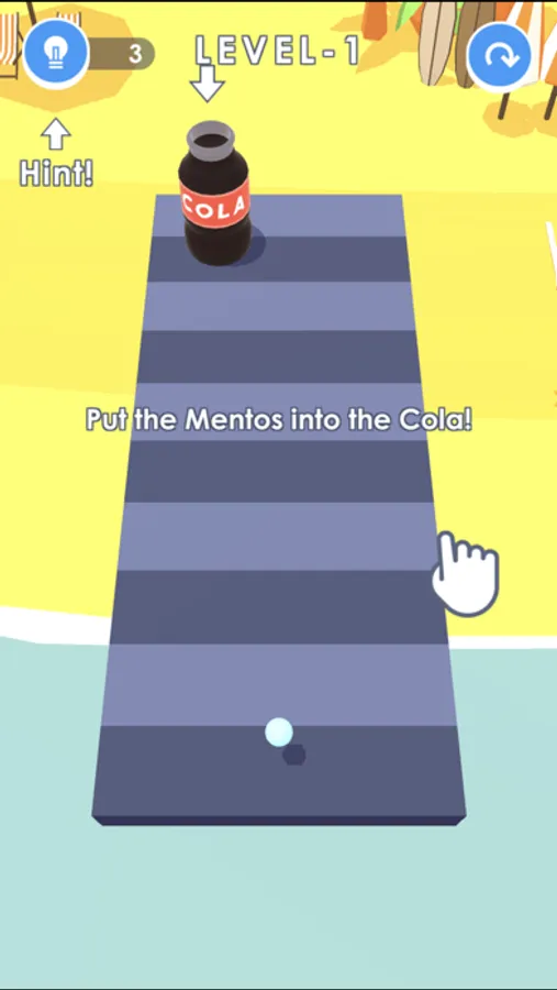 Hold and drag your finger to align where should the “Mentos” ball bounce. Lift your finger up to toss the ball into the Cola bottle.