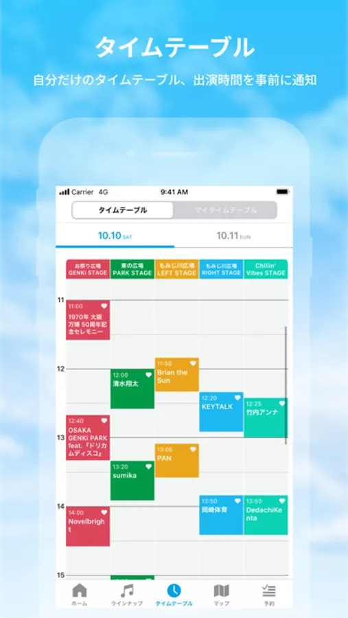 自分だけのマイタイムテーブルを作成できます。出演時間が近づくとプッシュ通知でお知らせします。マイタイムテーブルからプレイリストの自動作成も。