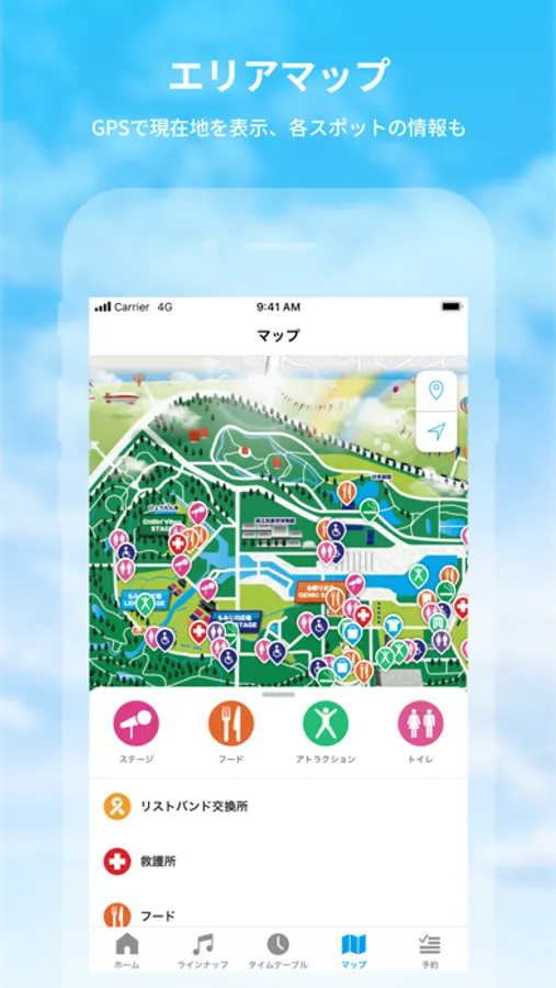 GPSと連動したエリアマップ。飲食店やステージやトイレなどの情報もマップ上でチェックできます。