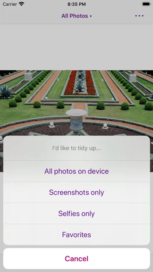 You have four modes to proceed, you can tidy up all photos on device, screenshots, selfies or favorite photos.