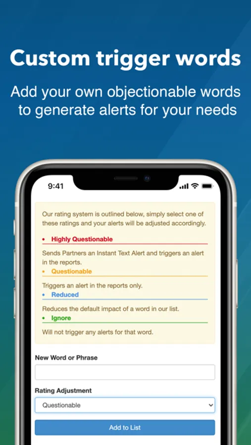 - Add your own custom trigger words to generate alerts for your specific needs, or whitelist phrases as non-objectionable (partners will be notified).