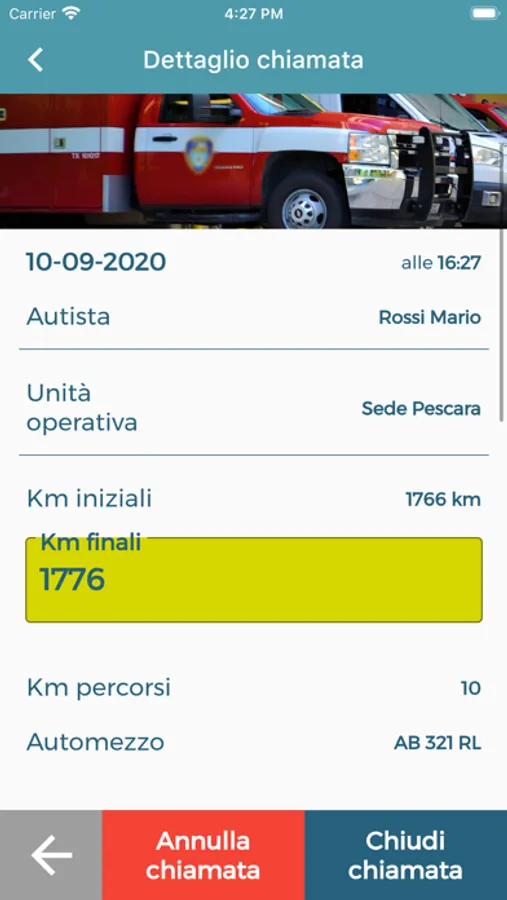 Quando un operatore termina il servizio che preso in carico può specificare i Km percorsi ed eventuali note.