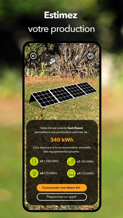 3) Estimation : une fois placé et configuré, vous aurez une estimation de l’énergie que le kit va produire à cet emplacement. Pour obtenir une estimation précise nous avons besoin de votre position géographique ainsi que l’orientation des panneaux.