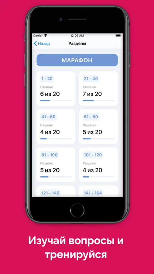 Изучение - открой список из 20 вопросов в каждом разделе, изучи вопрос и запомни ответ. Вопросы так же разбиты на темы.