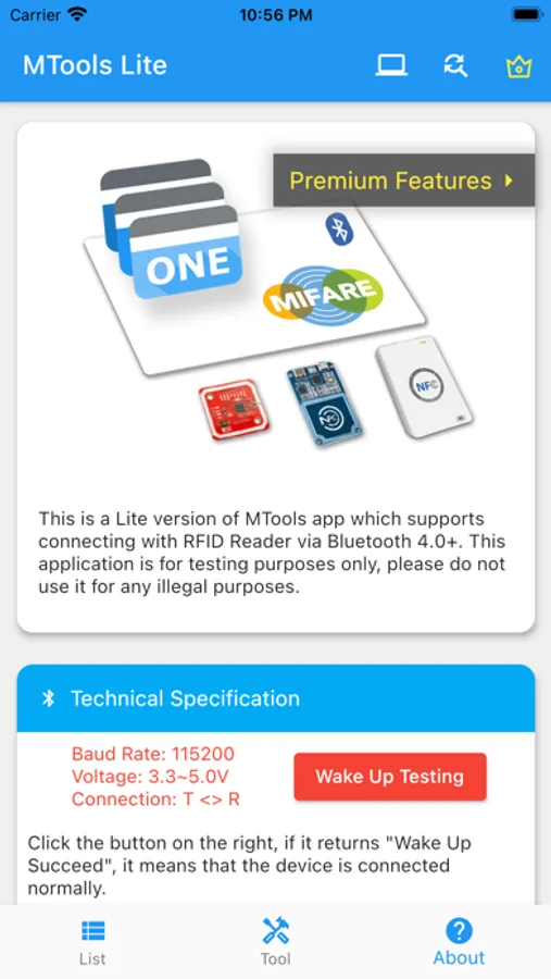 MTools app is a powerful app which uses coreNFC on iOS and BLE RFID reader to reading and writing ISO14443 cards, which include Mifare Classic 1K/4K, Mifare DESFire, Mifare Ultralight, Mifare Plus, NFC TAG, NTAG213, NTAG215, NTAG216, and other 13.56MHz IC card with APDU command.