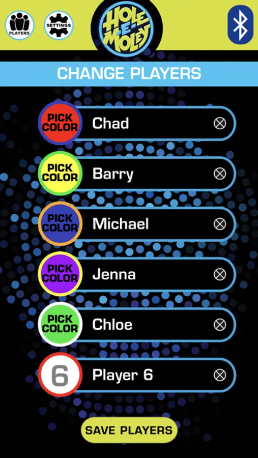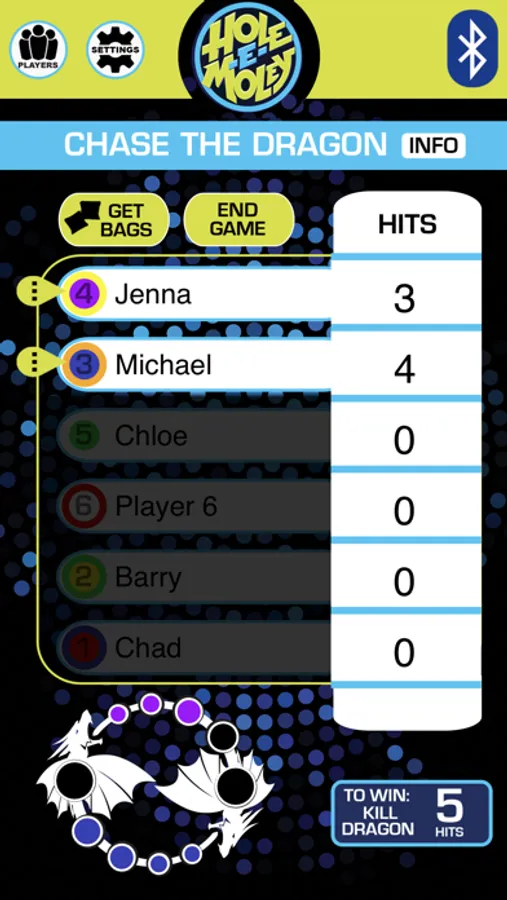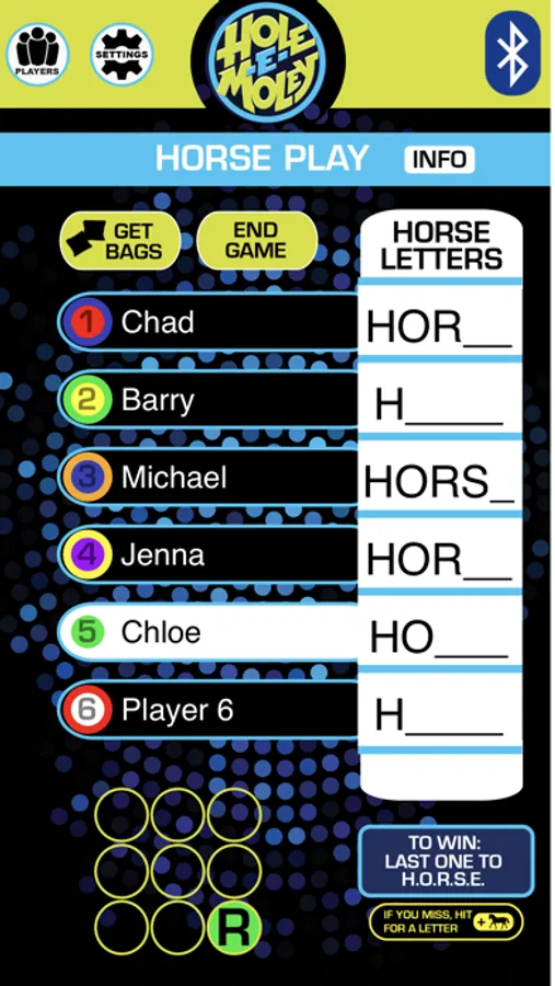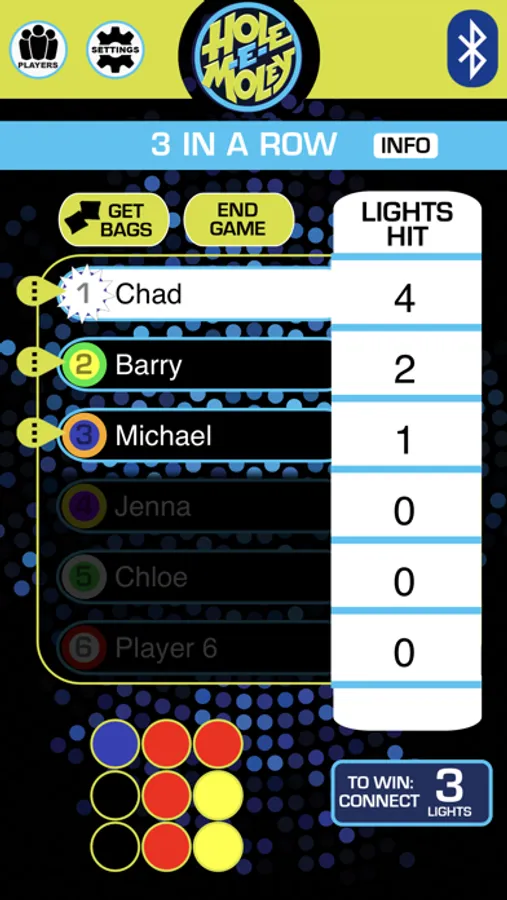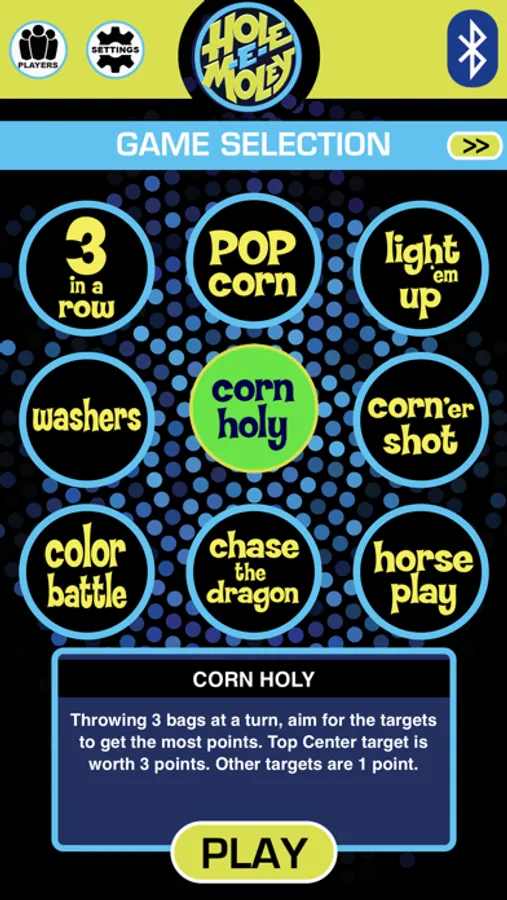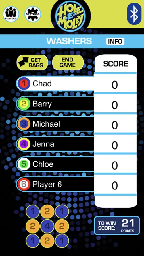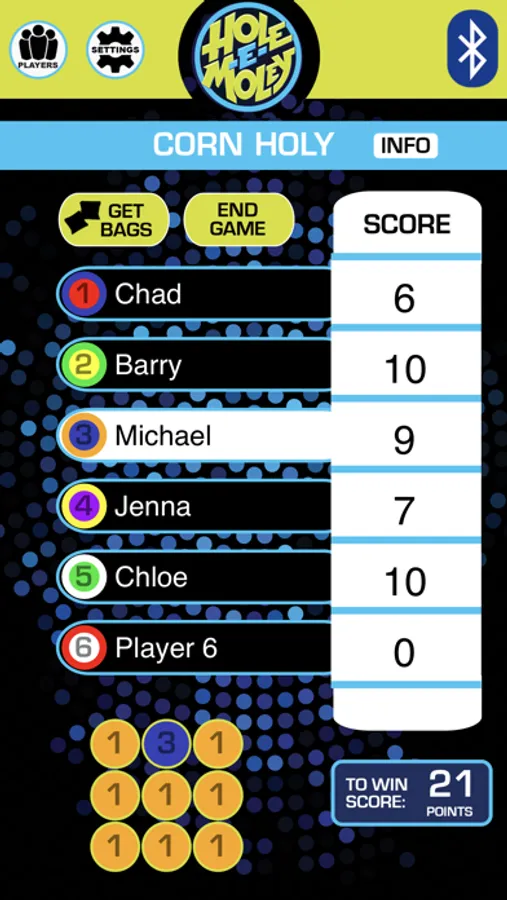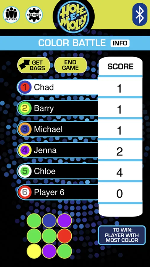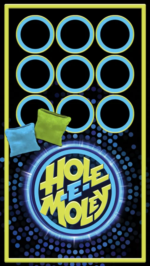 Hole-E-Moley™ is an App used to drive a multi-player, electronic cornhole board. The game allows up to 6 players, identified by color in the App and on the LED-lit board. Hole-E-Moley™ comes programmed with 9 fun and familiar games to play on a 9-target game board: