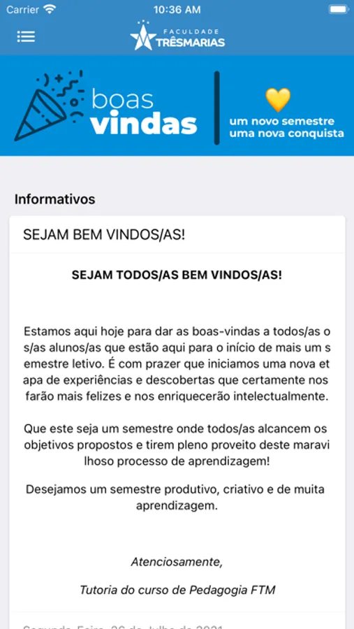 Agora, ficar conectado as novidades da FTM se tornou ainda mais fácil. Baixe já o app da faculdade e confira todas as suas notas, disciplinas e horários em um só lugar, atualize-se com os informativos e fale com a nossa equipe no chat em uma interface dinâmica e pensada especialmente para os nossos alunos.