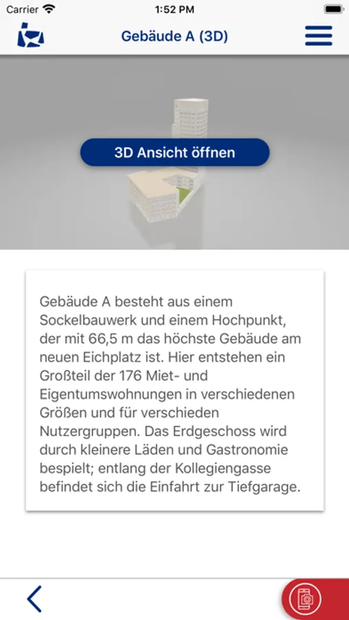 In der Eichplatz App erhalten Sie aktuelle Informationen zur geplanten Bebauung des EichplatzAreals (Baufeld A) in Jena. Erleben Sie schon jetzt das neue EichplatzAreal und tauchen Sie ein in 3D-Darstellungen und Augmented Reality Ansichten.
