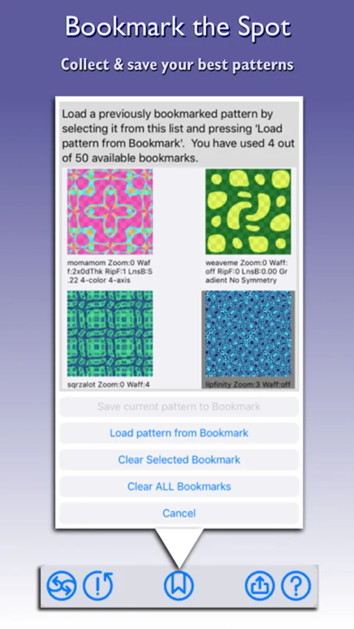 * "Bookmark" up to 50 of your favorite patterns for immediately popping back to any time.