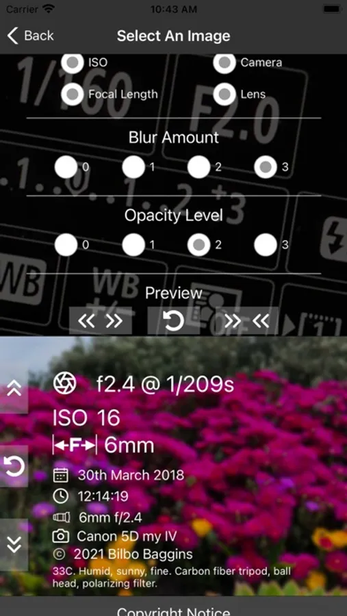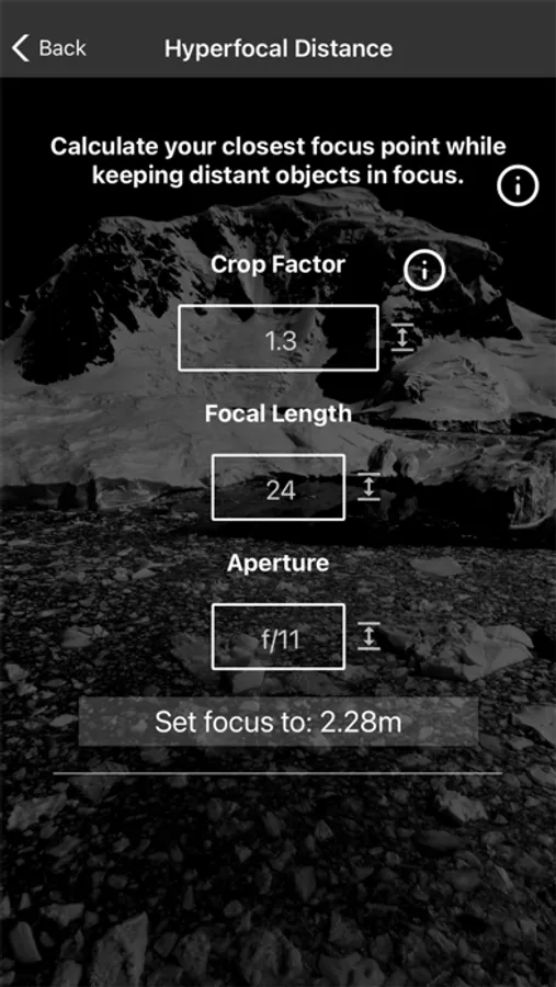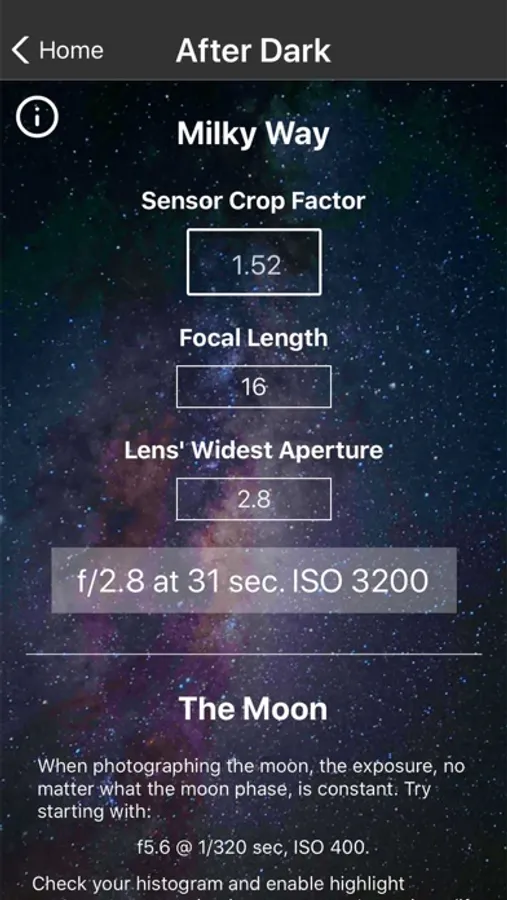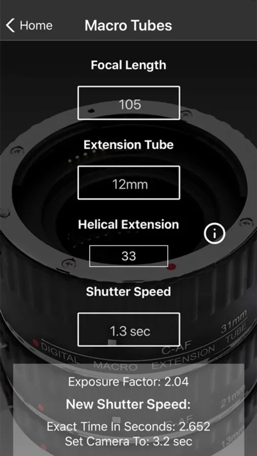 Calculate manual exposures for macro with a range of extension tubes. Get optical focal length when using extenders for any lens with any sensor size. Manual exposures for flash based on flash/strobe guide number, distance and f-stop. Get maximum print size for your sensor size at varying dpi. Find sunrise & sunset time for your location, plus weather, chill factor, wind direction, wind speed, weather forecast, and visibility. See the forecast aurora activity for your location plus your gps lat/long. Calculate hyperlocal distance based on sensor and lens focal length. Create a copy of an image that you want to upload to Instagram with camera EXIF data overlaid, with blur and opacity customisation. All this and more with this nifty photographers toolkit app.