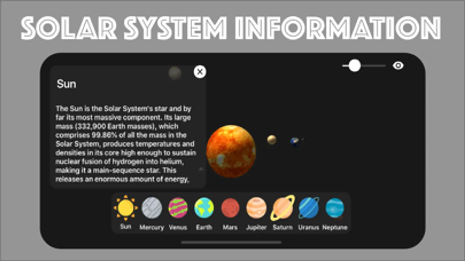 You can learn general information about planets. And you can interact with solar system, see it every angle.