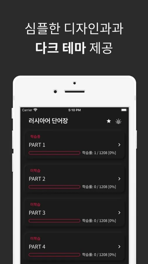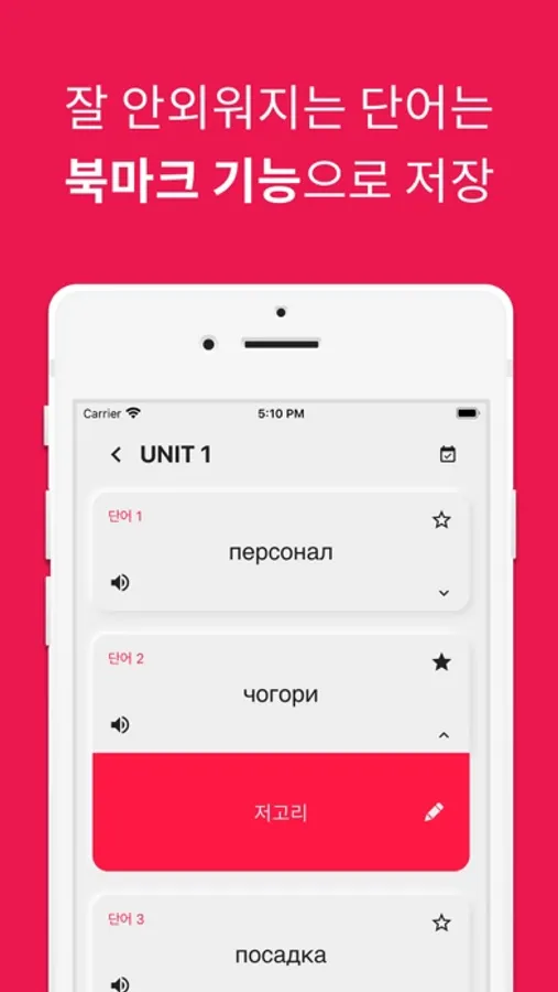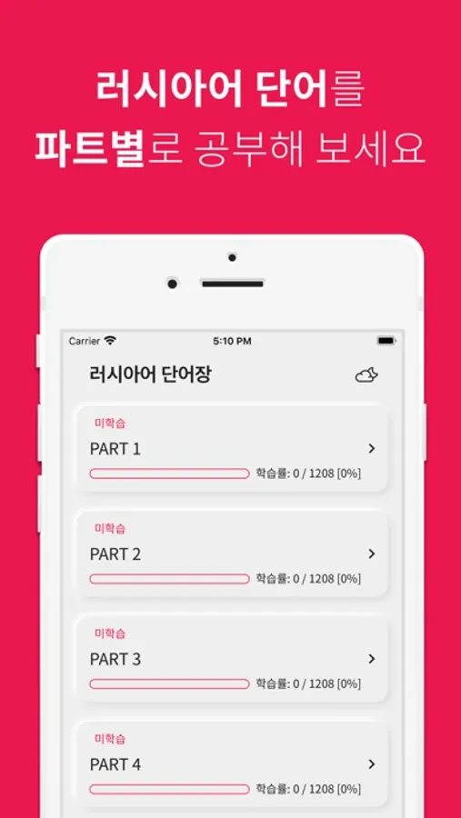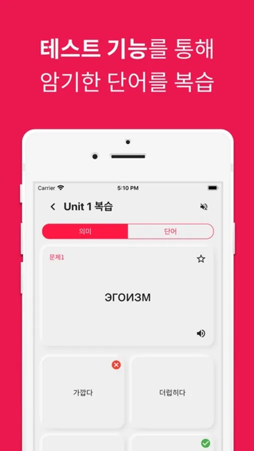 단어 공부는 역시 반복이죠! 공부한 러시아어 단어를 파트별, 유닛별, 전체 단위별로 복습할 수 있습니다.