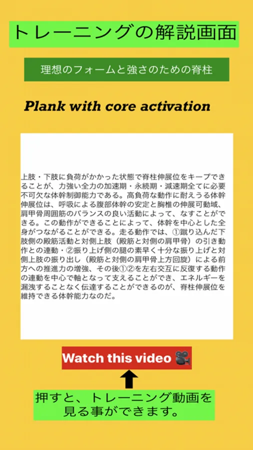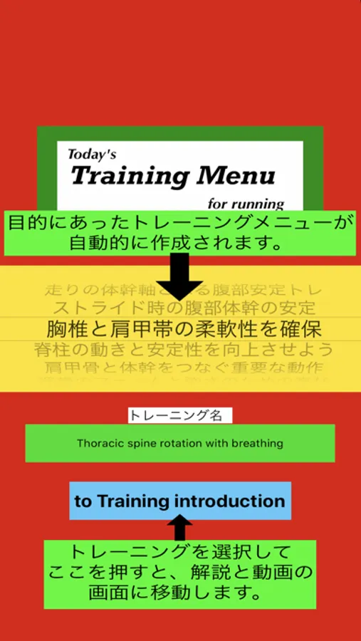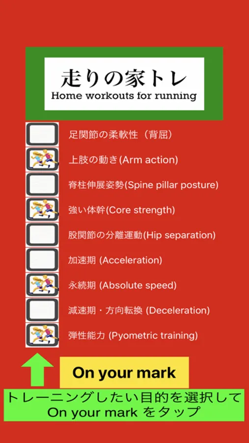 走る機能に重要な9つの身体機能から、あなたの目的にあったものを選択すると、自動的にトレーニングメニューが作成されます。また、各トレーニングには、結果の出せるトレーニングを進める上で重要な「理解度」を高めるための解説と、すべてのトレーニングに紹介動画が付属されているので、あなたのトレーニングの質を落とすことなく、正確な動作でトレーニングする事ができます。