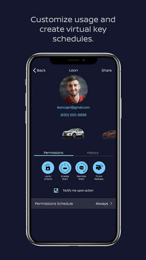 When you want to give someone access to your vehicle, easily create and send them a Virtual Key. Once the invite is accepted, they will be able to use the Nissan Virtual Key app to access and control your vehicle based on the permissions and time period you’ve allowed. You can also revoke access from within the app. You can share up to 7 Virtual Keys.