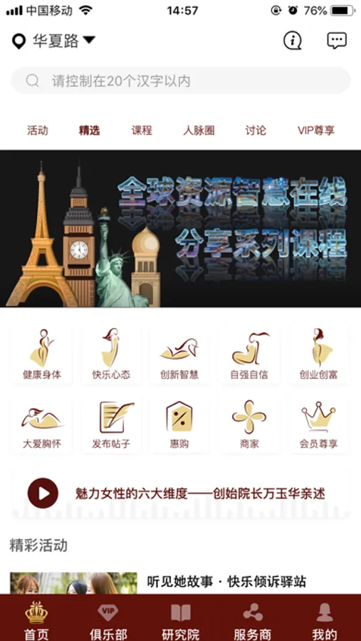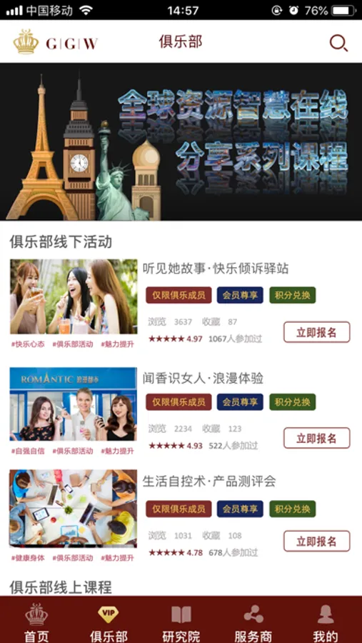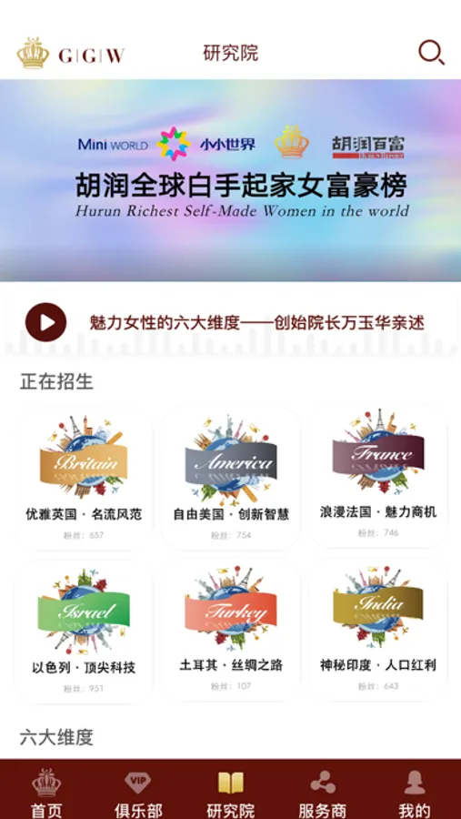 GGW Club是一款女性服务软件,用户可在各大应用商城免费下载,认证后即免费成为注册用户。GGW Club分为俱乐部、研究院以及服务商三大板块,围绕全球魅力女性六大维度,为女性提供一站式服务,旨在打造诚信自治生态圈。用户可通过发帖/互动/活动/购物等获得成长值,累积获得更高级别,获取更多消费优惠;成长值可兑换积分,积分可抵现使用;您也可以直接付费升级为尊享会员,尊享12项尊贵权益;加入俱乐部线下活动,更能有效帮助你提升魅力维度。总而言之,秉承着“缔造全球魅力女性,让世界变得更美好”的宗旨,我们一直致力于帮助更多女性提升魅力,获得成功与成长!