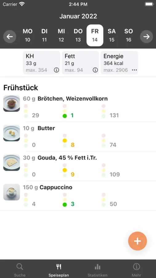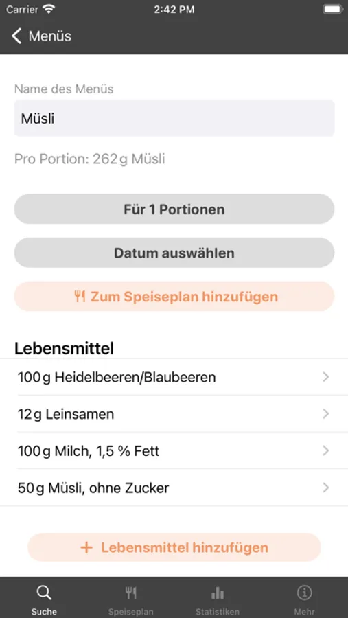 • Mengeneingabe in Gramm oder in üblichen Portionen