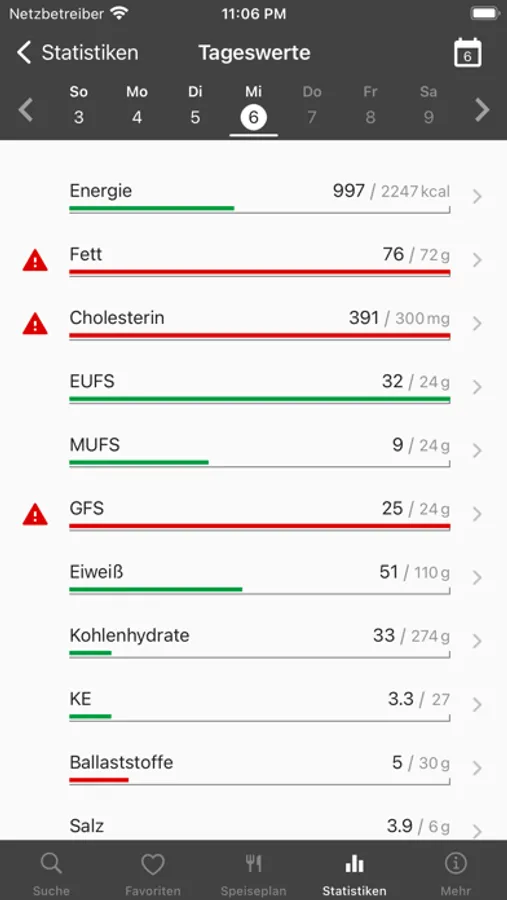 Kalorien, Eiweiß, Kohlenhydrate, Fett, Kochsalz, Ballaststoffe, KE (Kohlenhydrat-Einheit),Energiedichte, gesättigte Fettsäuren (GFS), einfach ungesättigte Fettsäuren (EUFS), mehrfach ungesättigte Fettsäuren (MUFS), Cholesterin