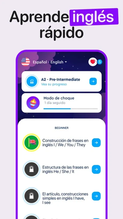 Cientos de horas de escucha de hablantes nativos como parte de un curso de inglés. Aprende inglés desde cero: palabras en inglés, gramática, pronunciación de inglés y expresiones útiles. Aprender inglés en casa es real. Usa nuestro diccionario de inglés y aprende inglés para principiantes. ¡Sigue aprendiendo inglés con nuestra app! ¡Aprende gramática inglesa y palabras en inglés de manera eficiente!