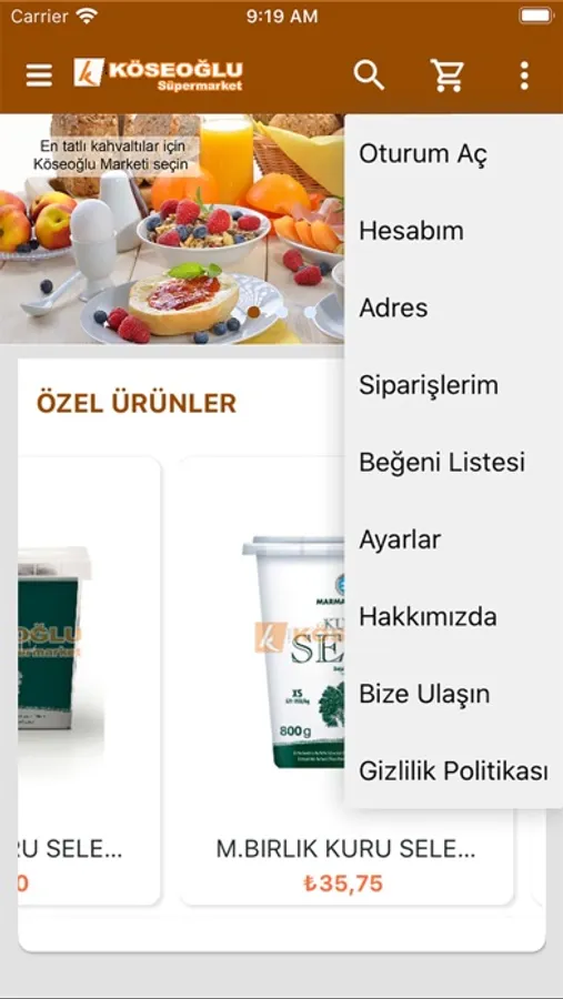 Kösoğlu Market Mobil Alışveriş Web Uygulaması iOS üzerinden ulaşılabilen, Kuzey Kıbrıs ta faaliyetlerine devam etmekte olan Köseoğlu Supermarketin bir mağazacılık uygulamasıdır. Uygulama ile mağaza müşterilerine, mobil cihazlar üzerinden online alışveriş yapma imkanı sağlamaktadır.