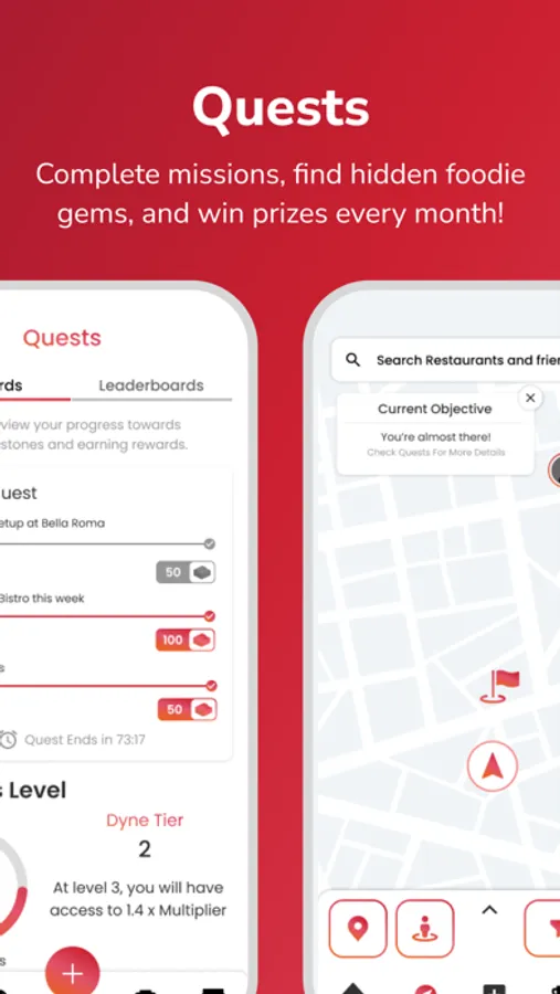 - Quests: Dyne turns every urban environment into a playground, with unique missions and challenges to complete at famous landmarks. Every month, the person who has done the most quests gets a grand cash prize! Even better, as you do more quests on Dyne over time, you will begin to level up and unlock more exclusive quests with bigger rewards and findings!