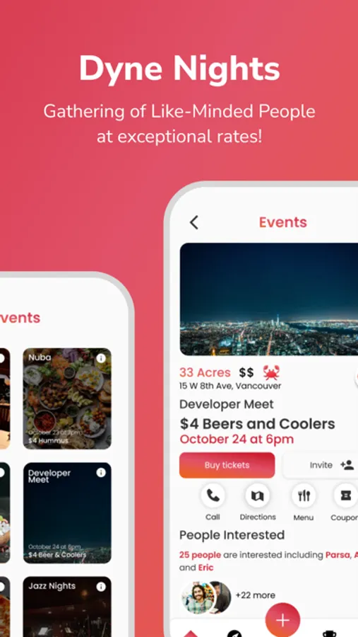 - Dyne Nights: our events service for all of Dyne’s partner restaurants! It’s a monthly gathering of like-minded individuals passionate about pushing the boundaries of the community. Dyne Nights is always an opportunity to meet new people and learn something new while also getting amazing deals on food. So whether you’re a Dyne novice or a seasoned pro, we invite you to come Dyne with us!