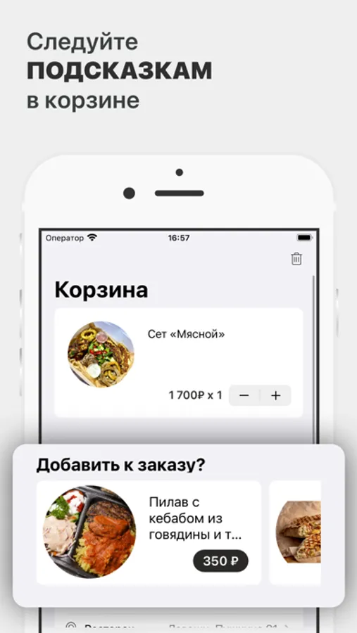 Как сделать заказ в приложении “Лаваши”: выберите понравившиеся позиции из меню, добавьте их в корзину и перейдите на экран оформления заказа (по нажатию на иконку корзины).