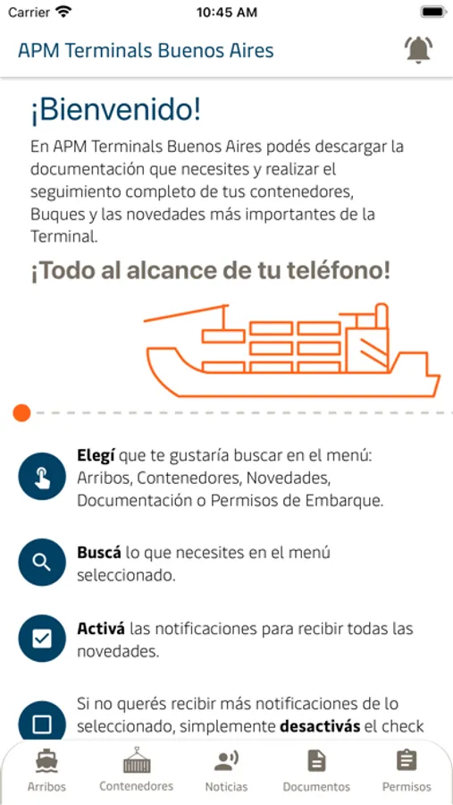 Podés recibir notificaciones de todo lo que te interesa saber sobre tu operativa: alertas sobre tus contenedores, noticias importantes de nuestra Terminal, novedades en tus permisos de embarque, cuándo carga o descarga tu contenedor, cuándo arriba el Buque a la Terminal, ¡y mucho más!