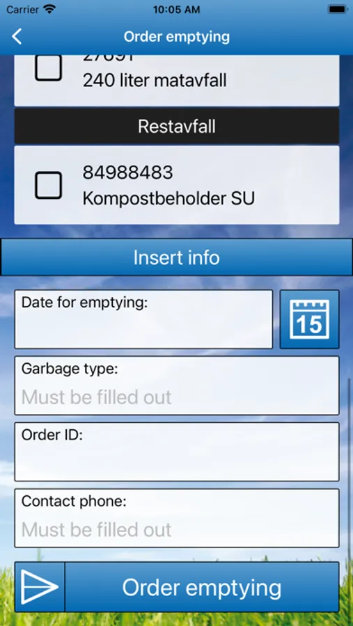 With this app you can order emptyings of your containers by TarpReno. The app shows current orders, and how far in the process they are. The app also shows statistics for completed orders.