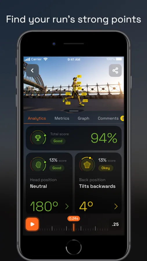 Ochy offers runners, coaches, and physiotherapists the possibility to perform a personalized full-body running form and gait from anywhere with the use of AI. That way runners can prevent injuries, run efficiently, and improve performance. The app identifies the runner’s strong / weak points and provides details on what they should do to improve. The app provides the following posture analysis and running metrics: