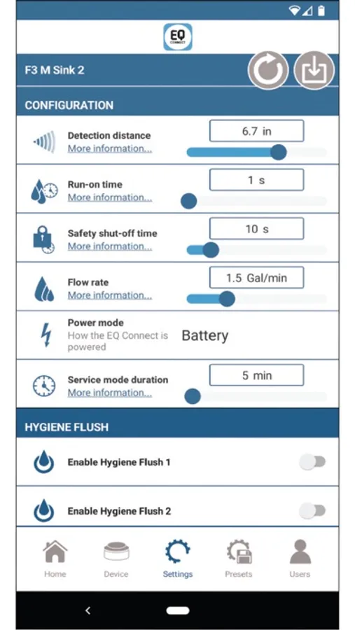 EQ® faucets with built-in Bluetooth® technology can now be monitored and controlled easily with a smartphone or tablet. The EQ® Connect App provides diagnostics and allows you to make adjustments to the faucet’s settings with the touch of a finger.