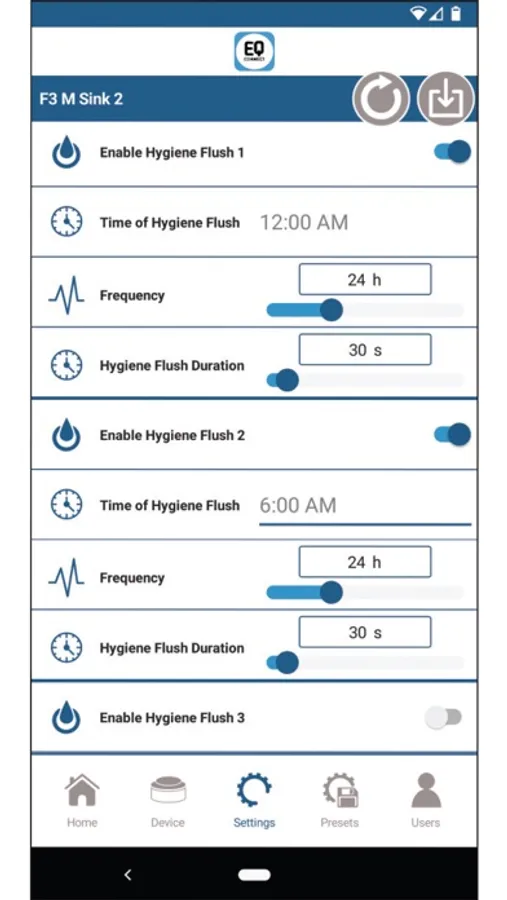 •Hygiene flush. Set an ongoing schedule to flush lines and faucet from 0-300 seconds.