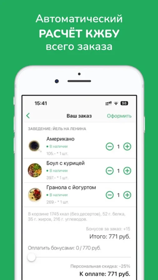 - Подсчёт КЖБУ всего заказа. В приложении у всех блюд (кроме десертов) подсчитан и проставлен КЖБУ. В момент подтверждения заказа в корзине показывается ОБЩИЙ КЖБУ, что даёт возможность правильно спланировать свой рацион питания.