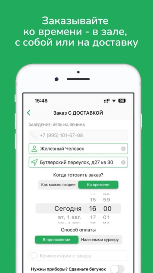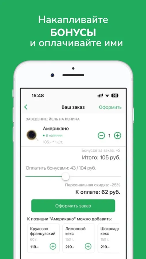 - Возможность оплаты непосредственно в приложении, используя Apple Pay или банковскую карту. Безналичный расчёт даёт нам возможность с минимальной потерей времени готовить заказы, не тратя время на обслуживание и расчёт на кассе.