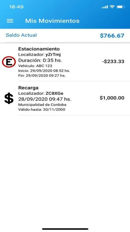 Desde la app, un usuario registrado puede consultar el histórico de sus movimientos: