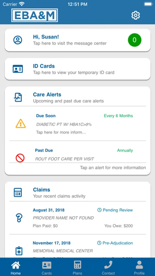 The EBA&M Mobile application allows registered employees and dependents to access their eligibility coverage information, ID cards and claims processing data. Please contact the EBA&M Mobile help desk for more information at (714) 668-8920.
