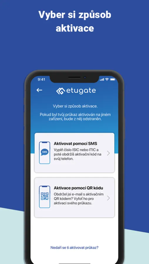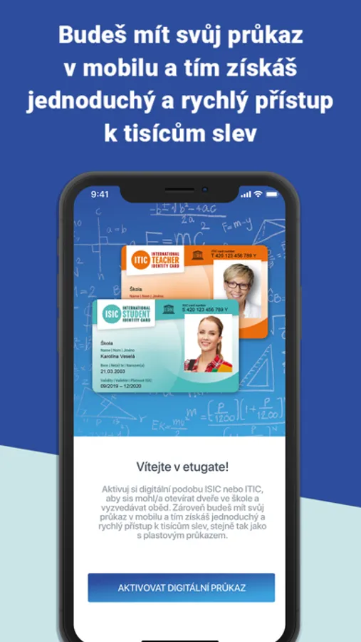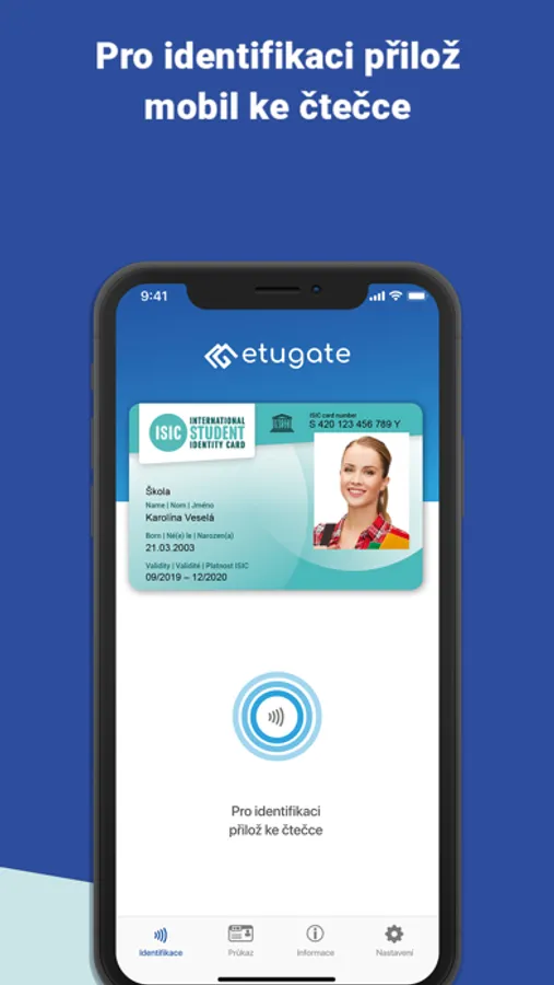 V aplikaci etugate můžeš zobrazit digitální podobu svého průkazu ISIC nebo ITIC a eliminovat tak nutnost plastového průkazu. Pomocí aplikace si ve škole otevřeš dveře, vyzvedneš oběd a vytiskneš vše potřebné. Stačí ji zapnout a přiložit mobil ke čtečce.