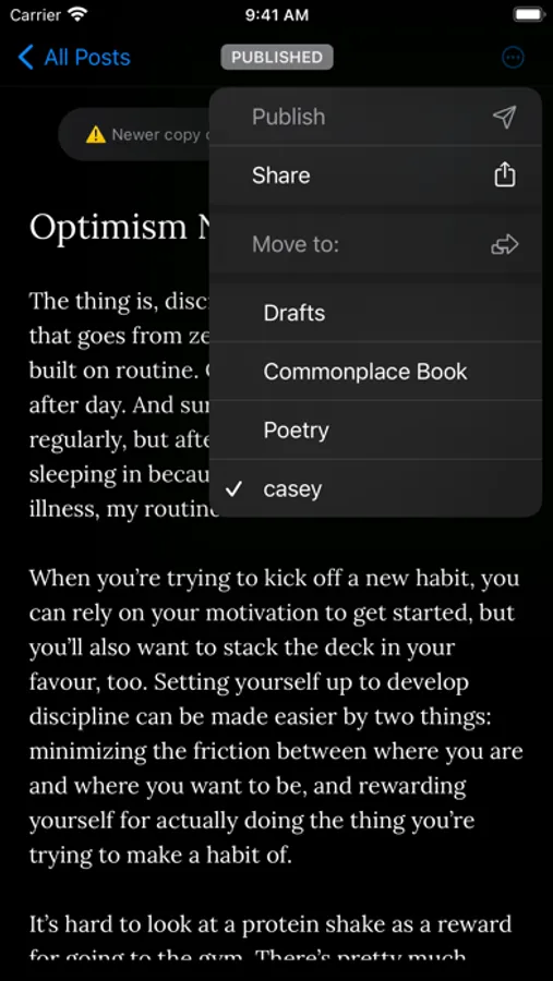 Publish to multiple blogs on your account, and move posts between blogs and Drafts with a few quick taps.