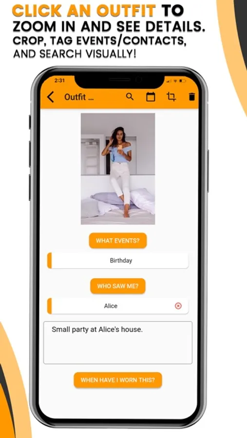 Tag each outfit with a custom event. Keep track of parties, birthdays, weddings, anniversaries, conferences, costume parties, and even what you wore to work.
