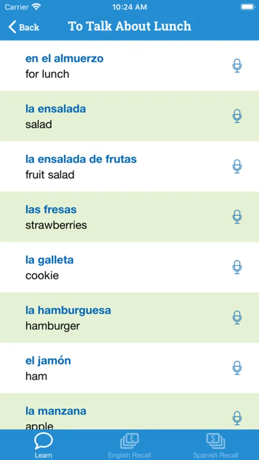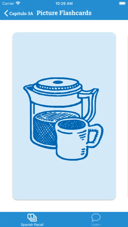 • Flashcards that challenge students to recall either Spanish or English for a given phrase or picture.